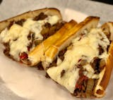 Shredded top sirloin sautéed on flat top with mushrooms, onions, peppers & mozzarella.